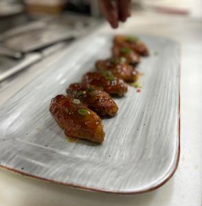 بال طعم دار شده، سس عسل و فلفل، پیازچه، کنجد _ سیب زمینی ژولین