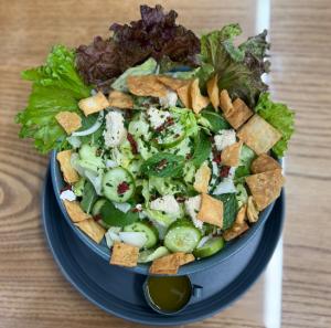 کاهو فرانسوی، کاهو پیچ، پنیر فتا، تان پیتا، گوجه گیلاسی ، خیار، پیاز، نعنا، جعفری، سس یونانی