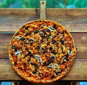 خمیر پیتزا آمریکایی، سینه مرغ طعم دار شده، میکس پنیر موزارلا، قارچ، زیتون