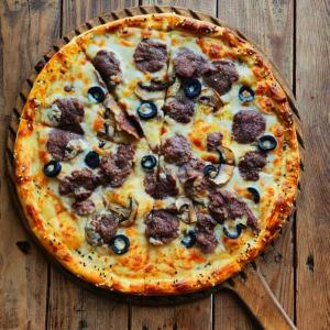 خمیر پیتزا ایتالیایی، استیک گوشت گوساله ورقه ایی، بیکن گوشت.پنیر موزارلا، قارچ، ، زیتون،