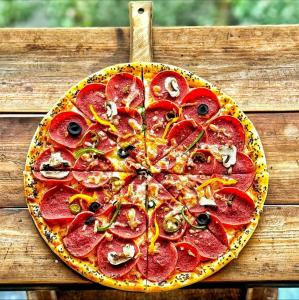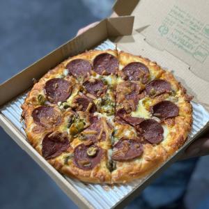 خمیر پیتزا آمریکایی، پپرونی 8۰%، قارچ، پنیر موزارلا، فلفل هالوپینو