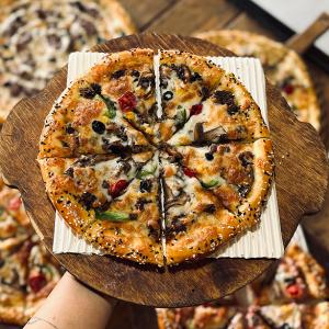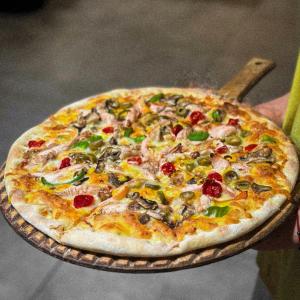 خمیر پیتزا آمریکایی، ژامبون گوشت ۸۰%، میکس پنیر موزارلا، قارچ، فلفل دلمه ای، زیتون