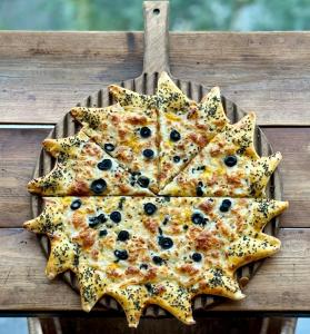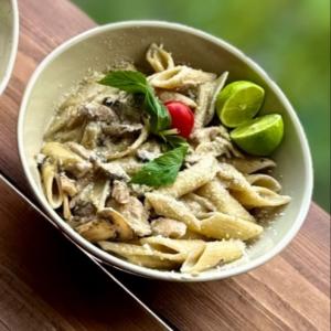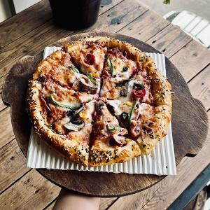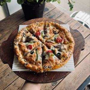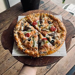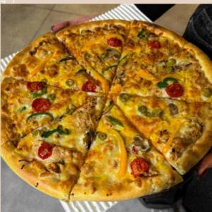 خمیر پیتزا ایتالیایی ،مرغ ،خامه، قارچ ،پنیر موزارلا،فلفل دلمه،زیتپن