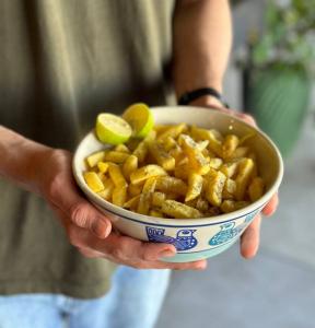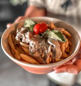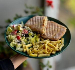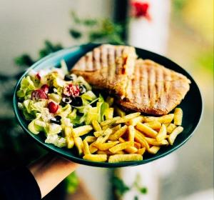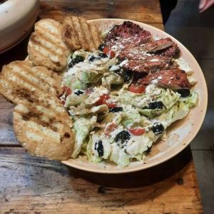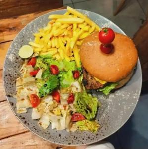نان چاپاتا، قارچ، گوشت چرخکرده گوساله، کاهو، پنیر گدار، سالاد،سیب زمینی