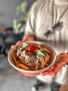 خمیر پیتزا ایتالیایی، مغز ران گوساله ریش ریش شده، سس خامه، پنیرموزارلا، فلفل دلمه ای، زیتون