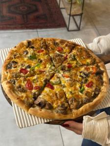 خمیر پیتزا ایتالیایی، پپرونی 90% آرمن ، میکس پنیر موزارلا، قارچ، فلفل هالوپینو، فلفل دلمه ای