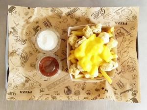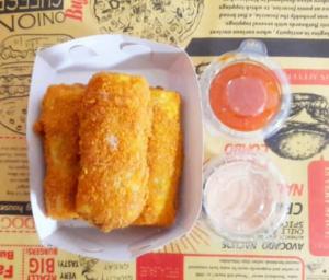 6 تکه فیله پنیری، سیب زمینی سرخ شده، قارچ سوخاری، سیب زمینی سوخاری، سالاد کلم، لیمو، سس و ادویه مخصوص