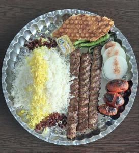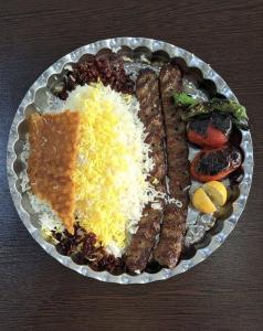 سه سیخ صد گرمی کوبیده با گوشت گرم گوساله ، ۵۰۰ گرم برنج ایرانی ، ته دیگ ، گوجه ، لیمو ، فلفل کبابی ، کره