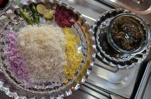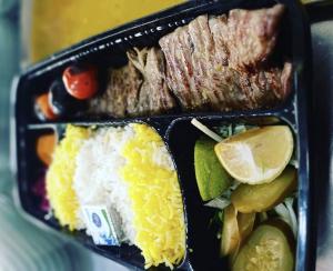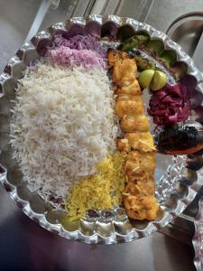 یک سیخ 250 گرمی فیله گوساله یک سیخ 100 گرمی کوبیده گوجه نارنج و ته دیگ و 450 گرم برنج هاشمی