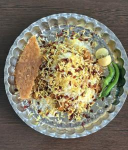قیمه لپه و ۵ تیکه گوشت گرم گوساله و بادمجان و گوجه