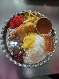 دو تکه کباب تابه ای 80 گرمی گوجه سرخ شده سس مخصوص سیب زمینی سرخ شده 450 گرم برنج ایرانی