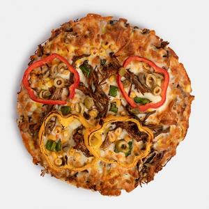 قارچ پخته شده، نخود فرنگی، فلفل دلمه، پنیر، گوجه، ذرت، زیتون، پیاز