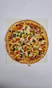 خمیر امریکایی،سس مارینارا،پنیر،ذرت،قارچ،گوجه،کدو،پیاز قرمز،فلفل دلمه،زیتون سیاه
