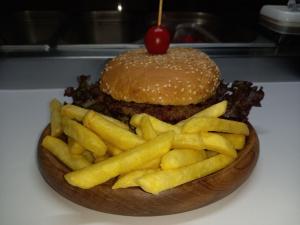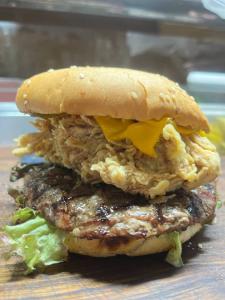 برگر ۱۷۰گرمی،دوتا فیله سوخاری،۲ عدد پنیر گودا،کاهو فرانسه،گوجه،خیارشور،سس مخصوص به همراه سیب زمینی سرخ شده